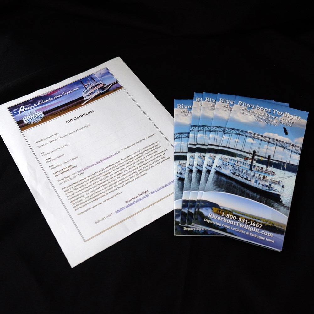 This cruise heads North from Dubuque through Lock & Dam 11 and takes in one of the most beautiful areas of the Mississippi River. Your cruise includes continental breakfast, a mid-morning and mid-afternoon snack, and a full lunch. Take in historical narration, great scenery, wildlife, and live entertainment. If river conditions allow, we will dock in Guttenberg and give our passengers the opportunity to depart the boat and spend time in this quaint, river town. Be sure to listen to the instructions from the Captain for the re-boarding time. Lunch will be served after we depart from Guttenberg. If we are unable to dock in Guttenberg, lunch will be served at approximately 12:15pm. Arrival time back at Dubuque is approximately 5:00pm. Items can be collected after you check out, after the live auction. If you are not attending the Gala, you may pick up your items at The Galena Center for the Arts.