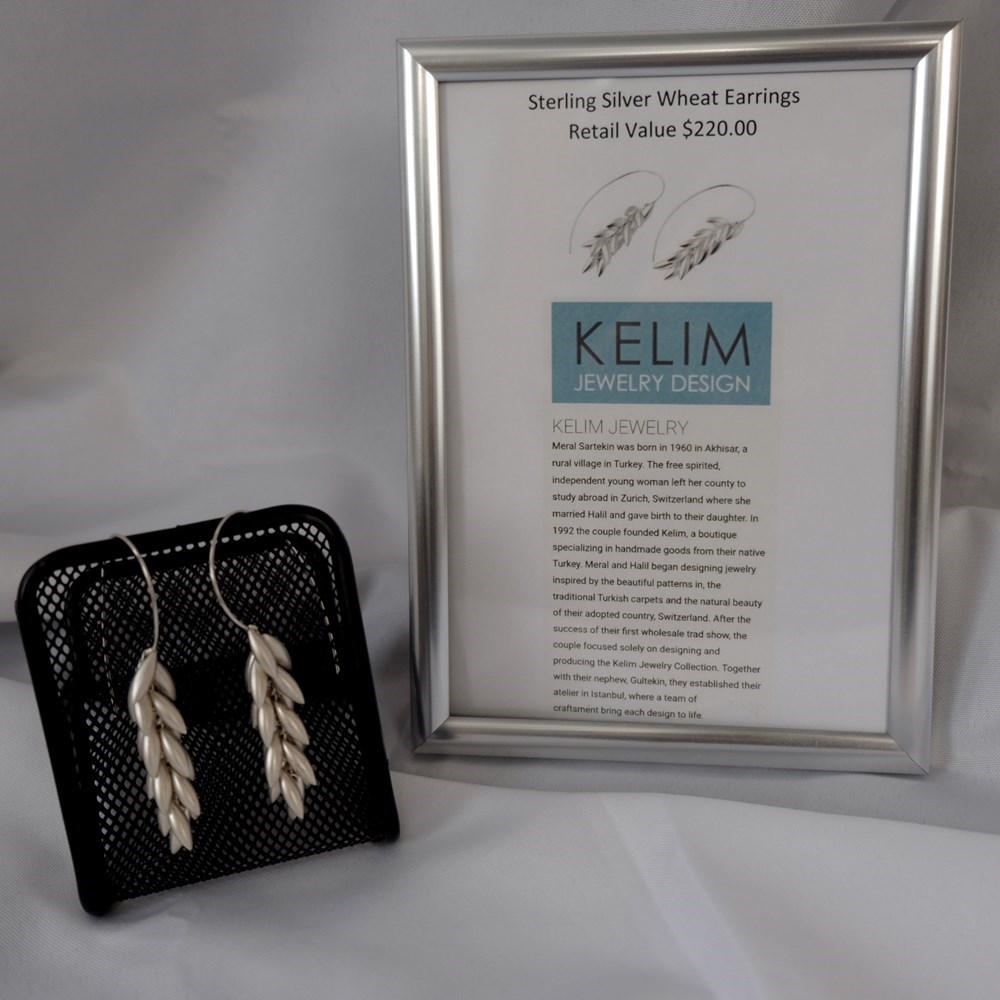 These Silver Wheat earrings are a sample of Kelim Jewelry. Kelin Jewelry is a boutique specializing in handmade goods from Turkey. The jewelry design is inspired by the beautiful patterns in traditional Turkish carpets. Items can be collected after you check out, after the live auction. If you are not attending the Gala, you may pick up your items at The Galena Center for the Arts.